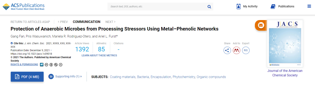 [1] Gang Fan, Pris Wasuwanich, Mariela R. Rodriguez-Otero, and Ariel L. Furst. Protection of Anaerobic Microbes from Processing Stressors Using Metal–Phenolic Networks, Journal of the American Chemical Society, 2021