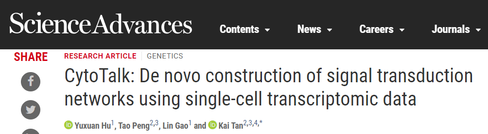 近日,西安电子科技大学高琳教授和胡宇轩博士联合宾夕法尼亚大学/费城儿童医院谭凯教授和彭涛博士后在Science Advances杂志在线发表了题为CytoTalk: De novo construction of signal transduction networks using single-cell transcriptomic data的研究论文,该研究开发了一种从头构建细胞类型特异性信号转导网络的新算法CytoTalk。研究人员利用单细胞转录组数据,将信号网络推断问题转化为图论中斯坦纳森林问题求解。CytoTalk不依赖于已知的信号通路注释信息,能够刻画信号网络在不同组织和不同细胞类型间的异质性,有望揭示健康组织或肿瘤微环境中的细胞间通讯新机制。