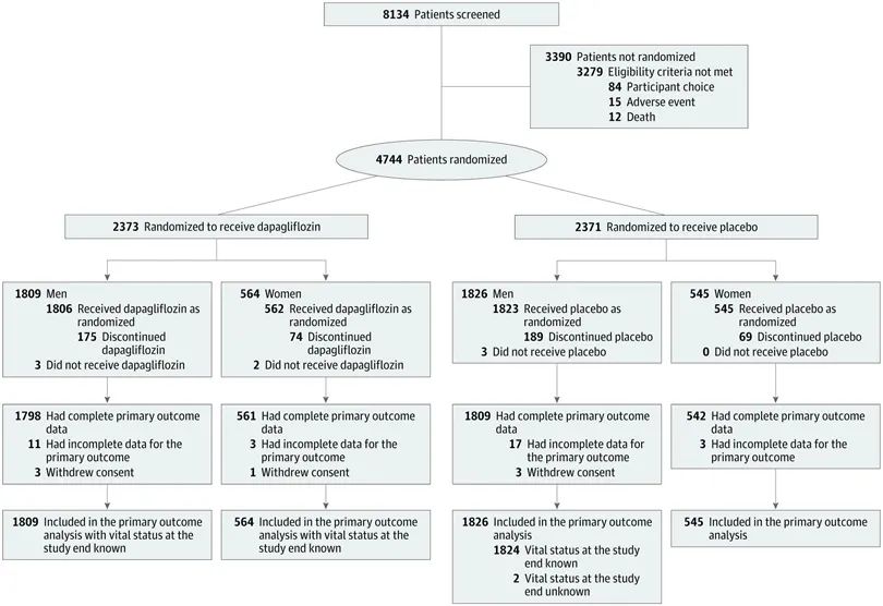 共4744例患者被随机分配接受达格列净或安慰剂治疗(其中女性患者1109例,占比23.4%)。
