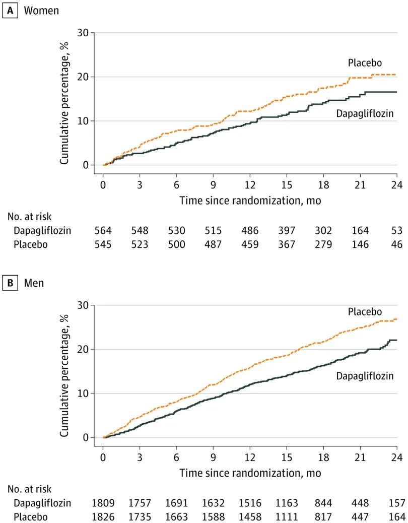 研究结果表明,与安慰剂相比,在男性患者和女性患者中,达格列净分别降低心衰恶化或心血管死亡风险达27%(HR 0.73)和21%(HR 0.79)。