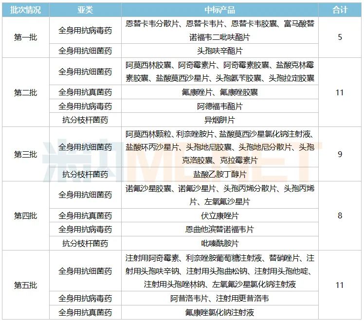 国家集中带量采购目前已完成五批六轮,超过200个产品被纳入目录,从大类来看,全身用抗感染药物最多,达44个,且每一批次均有涉及。如此“重锤”之下,市场承压不可避免,同时也为新药进入市场腾出了空间。