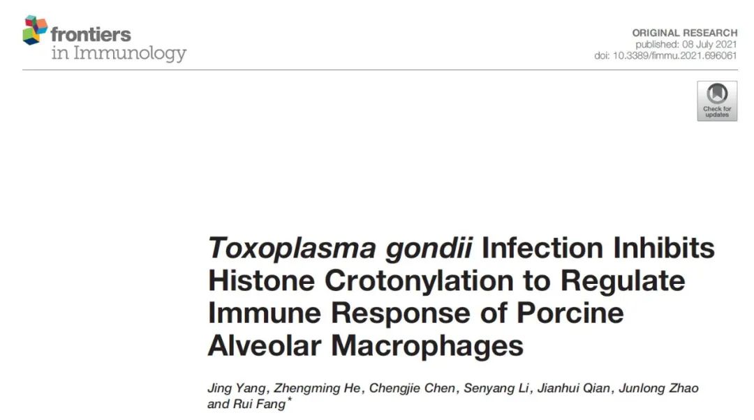 Yang J, et al., 2021. Toxoplasma gondii infection inhibits histone crotonylation to regulate immune response of porcine alveolar macrophages. Frontiers in Immunology.