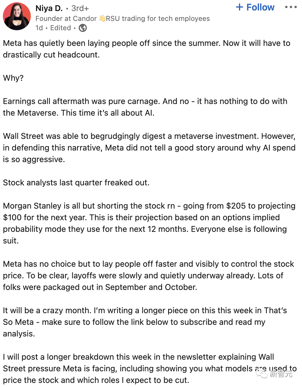 这位分析师表示,其实从今年夏天开始,Meta就一直在悄咪咪地裁员。而现在,它将不得不大幅裁员。
