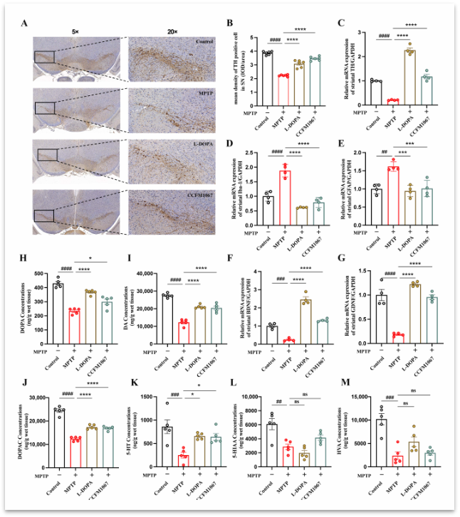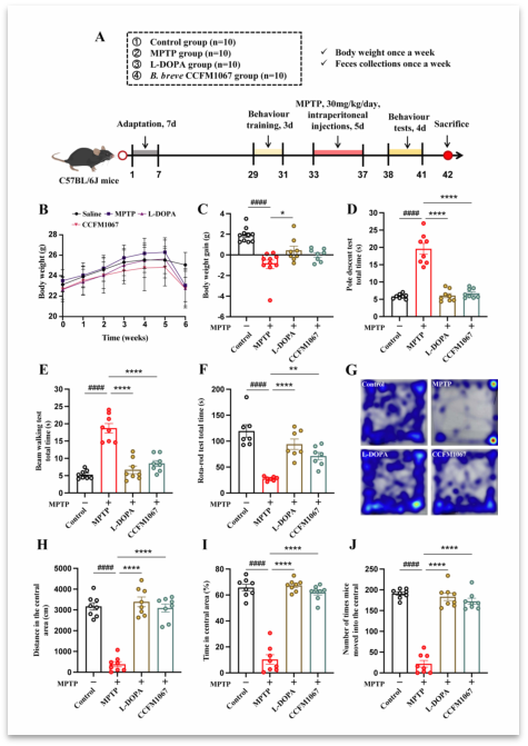 研究者选取40只6周龄雄性C57BL/6小鼠,随机分为四组,每组10只:对照组、MPTP组、L-DOPA组和B. breve CCFM1067组。需要说明的是,MPTP是1-甲基-4-苯基-1,2,3,6-四氢吡啶的简称,可用于实验动物帕金森疾病模型的构建;L-DOPA是左旋多巴的简称,为多巴胺(DA)的前体药物,目前认为可改善帕金森病症状;B. breve CCFM1067为短双歧杆菌的一种。