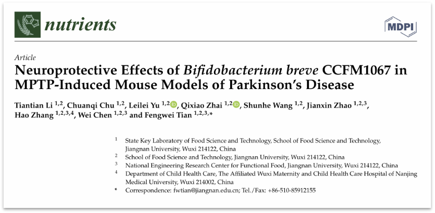 Tiantian Li, Chuanqi Chu, Leilei Yu, et al. Neuroprotective Effects of Bifidobacterium breve CCFM1067 in MPTP-Induced Mouse Models of Parkinson’s Disease. Nutuients. 2022, 14, 4678.