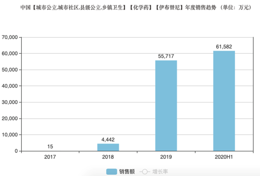 2017年强生伊布替尼获国家药监局批准在中国上市(商品名为“亿珂”,剂型胶囊,规格为140mg),进入医院市场后销售额迅速增长,2018年经医保谈判大幅降价后更是快速放量。价格从原来的48600元/盒降为17010元/盒。米内网数据显示,销售额从2018年的4442万增长到2019年5亿5717万,2020年在疫情影响下销售额依旧涨势不减,