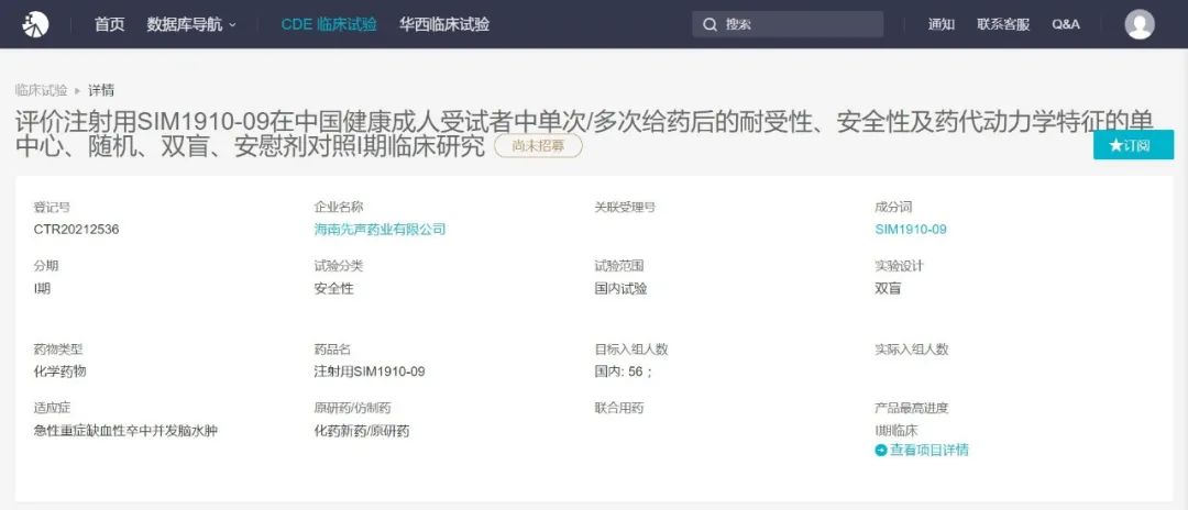 10 月 21 日,Insight 数据库显示,先声药业启动了 SIM1910-09 的临床试验,用于急性重症缺血性卒中并发脑水肿。SIM1910-09 即 SIM-307,是一款 First-in-class 小分子水通道蛋白 4(AQP4)抑制剂,先声在 2019 年 11 月从 Aeromics 公司获得了这款产品的大中华区权益。临床试验详情