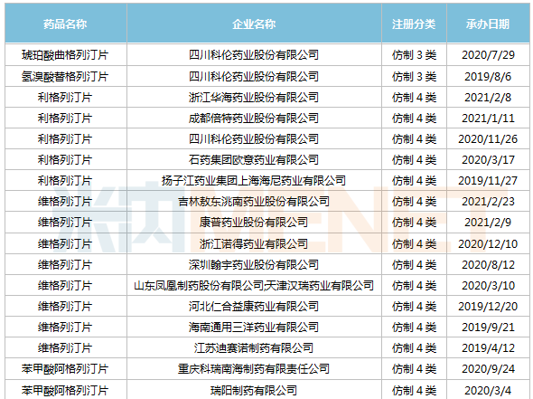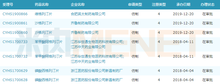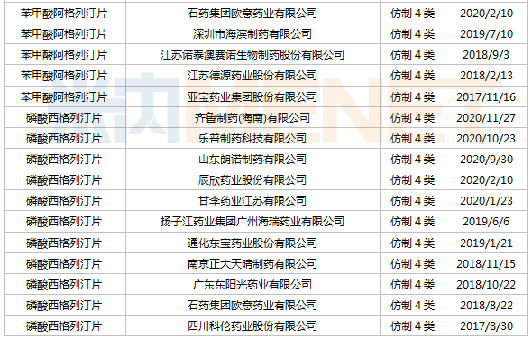 目前,利格列汀片获批仿制企业仅有东阳光药;磷酸西格列汀片获批企业有正大天晴药业集团和东阳光药,浙江医药冲刺国产第3家;沙格列汀片获批企业有奥赛康、正大天晴药业集团及豪森药业,齐鲁制药冲刺国产第4家。
