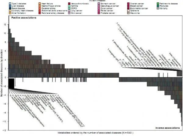 研究人员发现,至少2种非传染性疾病会共享420种代谢产物,而其在640种显著的代谢疾病关联中占到了65.5%的比例。文章中,研究人员整合了50多种不同的临床风险因素和特征的基线数据库,以此来确定这些代谢产物所代表的可操作的共享通路,相关研究结果强调了机体的肝肾功能、脂质和葡萄糖代谢、低级别炎症、肠道微生物多样性的替代物以及特定的健康相关行为,或许都能作为常见的可早期预防的非传染性多病症的因变量。
