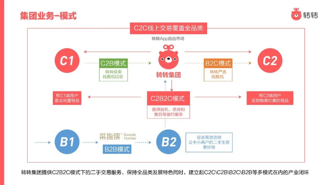 手机3C业务上,转转集团建立起涵盖B2C\C2B\B2B等多模式在内的产业闭环;此外,集团提供C2B2C模式下的二手交易履约服务,包括为消费者提供验机、质保和售后等。