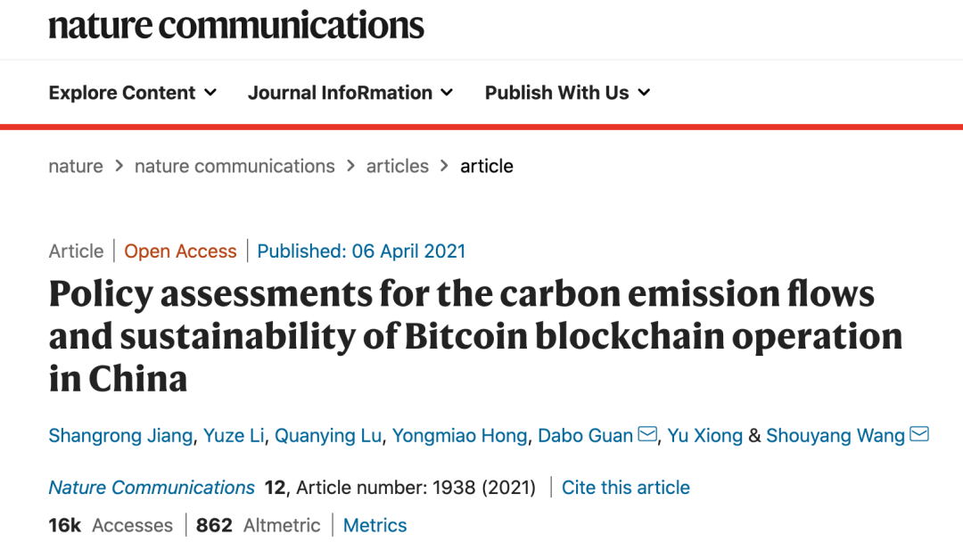 由中国清华大学的关大博、中国科学院数学与系统科学研究院的汪寿阳和同事领导一项研究发现在没有任何政策干预的情况下,中国比特币区块链的年能耗预计将在2024年达到峰值29659Twh,并相应产生1.305亿吨的碳排放。这些影响或威胁到全球为可持续发展付出的努力。研究结果于2021年4月6日发表在《自然-通讯》上。