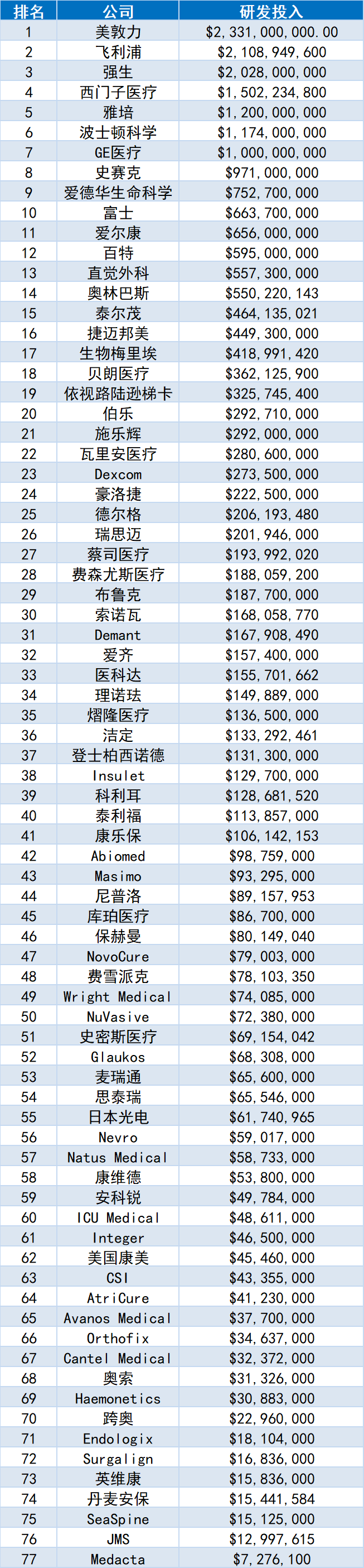 近日,国外权威的医疗器械第三方网站Medical Design and Outsourcing发布了《全球医疗器械研发排行榜》,公布了前77强的名单,美敦力依旧高居榜首,其次是飞利浦、强生、西门子。