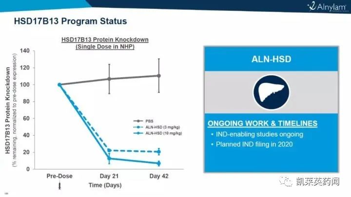 ALN-HSD是Alnylam与再生元合作开发的皮下注射 RNAi 治疗药物,靶向HSD17B13基因,用于治疗 NASH。根据新英格兰医学杂志的研究,HSD17B13基因功能丧失突变与慢性肝病以及脂肪变性向脂肪性肝炎进展的风险降低相关。临床前数据表明,HSD17B13在患有非酒精性脂肪性肝病(NAFLD)的小鼠和人类肝细胞中表达显著上调。根据此前在EASL国际肝脏大会上公布的数据,在一项I/II期单剂量和多剂量递增研究中,ARO-HSD能显著降低肝HSD17B13的mRNA和蛋白质水平,从而导致血清丙氨酸转氨酶(ALT)水平的降低。ARO-HSD是首个实现肝HSD17B13的mRNA和蛋白降低的药物。