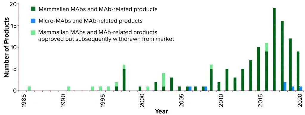 21世纪,生物药逐渐超越化学药,占领药品市场。2018年,全球销售排行前10的药品中有8个是生物药。过去5年中,抗体药在药品市场销售中也名列前茅。2018年,全球治疗性单抗市场估值1152亿美元,2019年末提升至1500亿美元,2025年有望达到3000亿美元。治疗性抗体药物发展呈爆发式增长,已被批准用于治疗各种人类疾病,包括癌症、自身免疫、代谢和感染性疾病。2018年,多款单抗产品每年销售额超过30亿美元,另有6款超过60亿美元(adalimumab,nivolumab,pembrolizumab,trastuzumab,bevacizumab,rituximab),其中adalimumab(阿达木单抗)创下了生物药销售最高记录,近199亿美元。