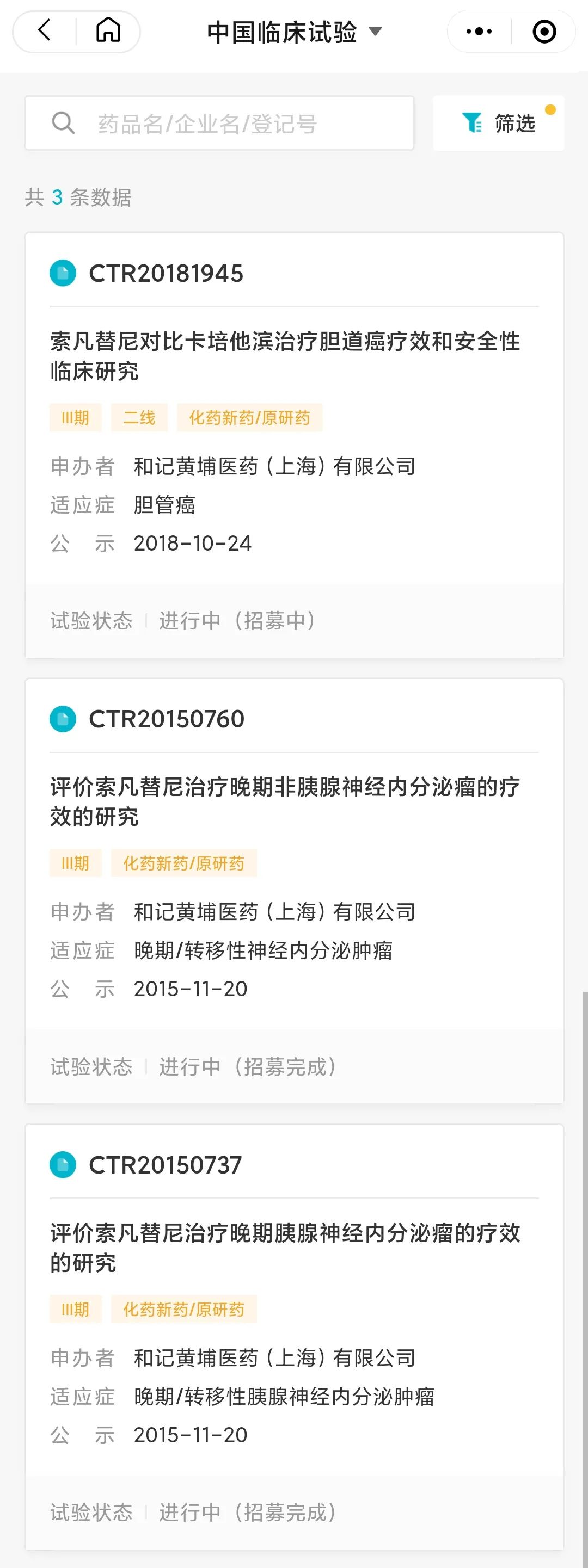 对实体瘤的研究,在数个癌种领域均有涉猎。在国内,和记黄埔共启动了 11 项临床试验,其中包括 3 项 III 期临床,适应症分别为胆道癌、胰腺神经内分泌肿瘤和非胰腺内