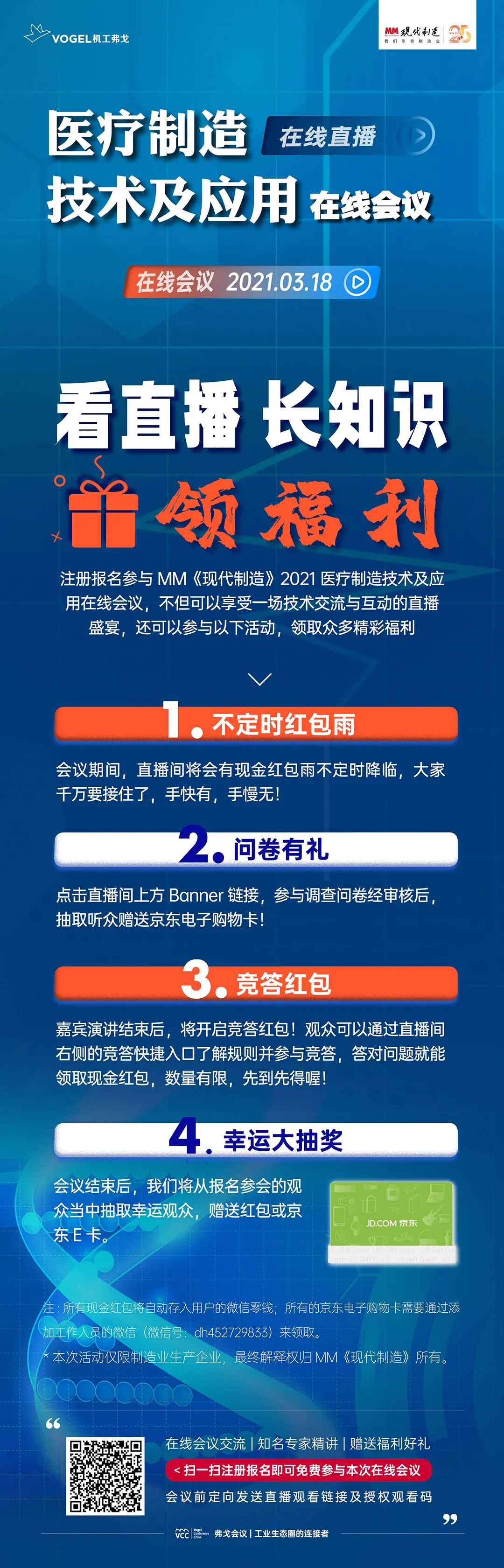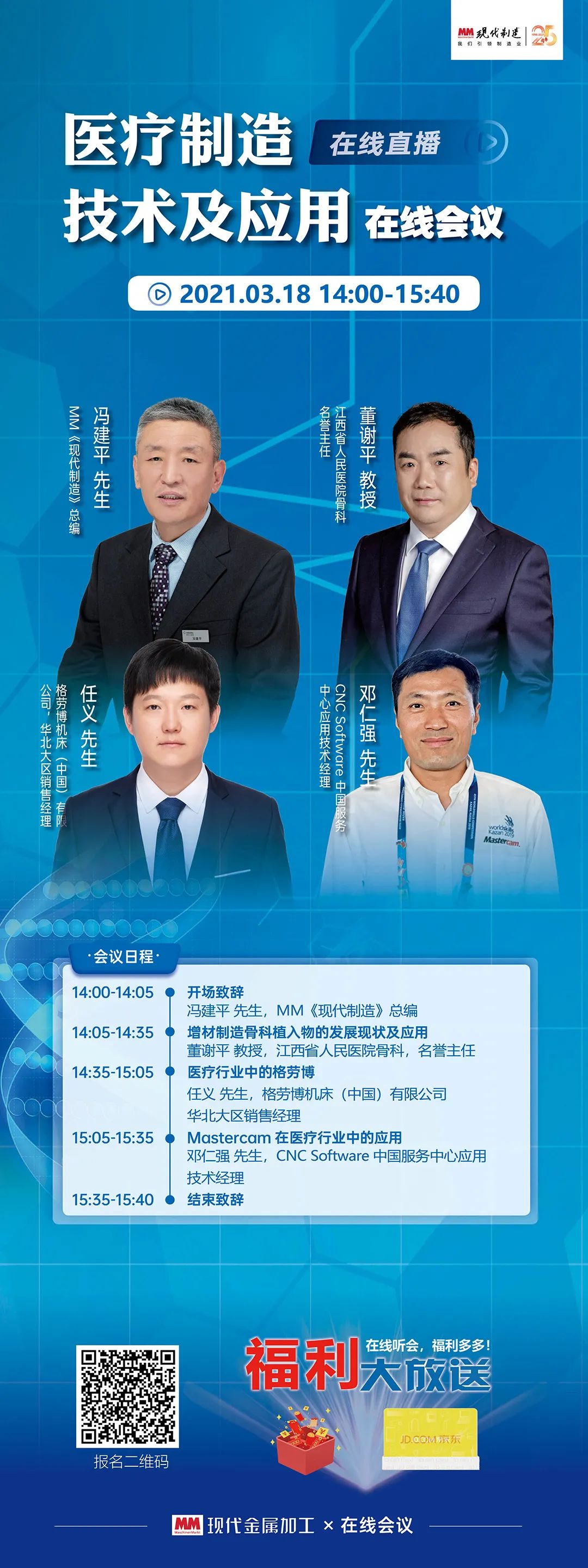 为了进一步保证医疗器械制造实现高质量、高稳定性的精准加工,促进医疗领域迎接新一代技术变革的到来,MM《现代制造》将联合中国医疗器械行业协会于2021年3月18日举办“ 医疗制造技术及应用在线会议”,届时将邀请医疗制造领域的领导专家以及来自机床、激光加工、测量、刀具、夹具及软件等行业企业的技术专家进行交流探讨,旨在为行业客户及广大医疗器械制造及关键零部件生产企业答疑解惑,提供帮助。