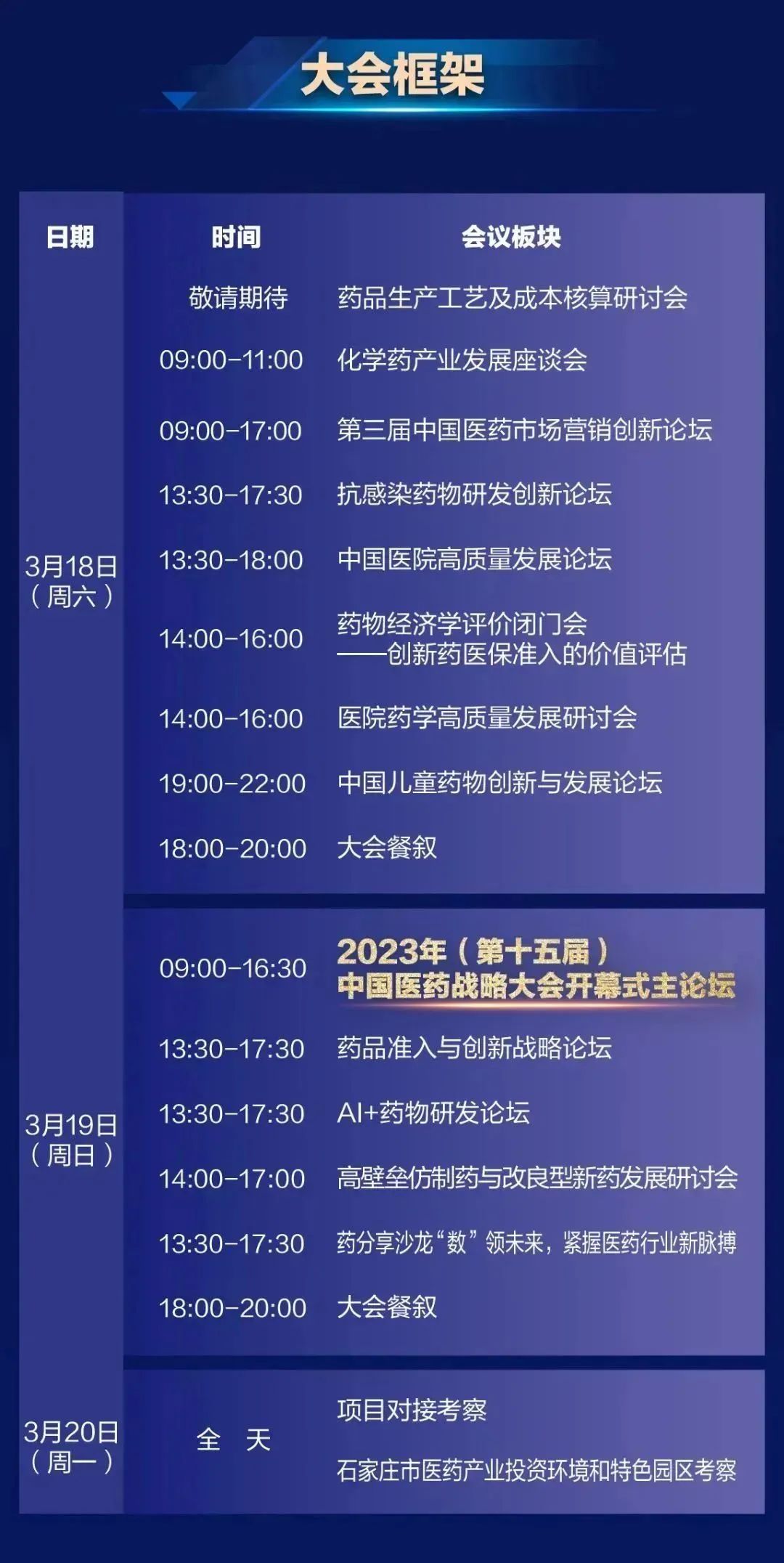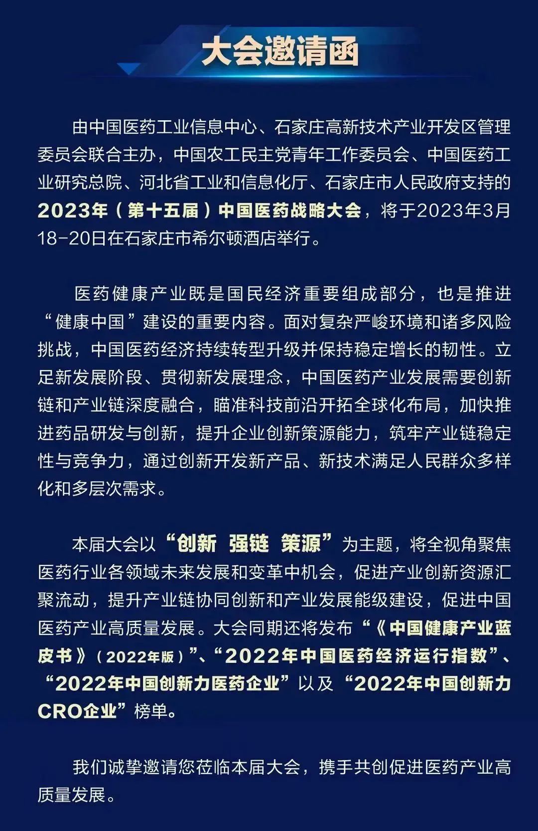3月18-20日,2023年(第十五届)中国医药战略大会即将在石家庄召开。