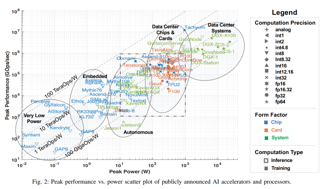 今年的论文中包含了两个基于加速器发布日期的新趋势图,以及一些神经形态的、光子的和基于忆阻的推断加速器的附加趋势。