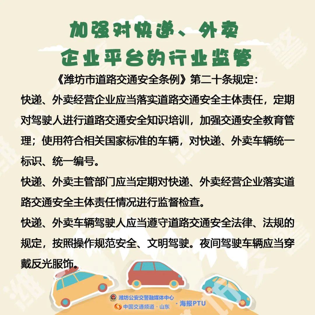 潍坊交警将在全市严查三轮车、四轮车交通违法行为,重点是无牌、逆行、闯红灯等严重交通违法行为。加大巡逻管控力度,保持路面常态严管态势。在重点时段、重点路段开展集中统一行动,重点管控,采取有效措施,确保道路交通安全。
