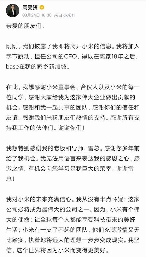刚刚,我们披露了我即将离开小米的信息。我将加入字节跳动,担任公司的CFO,得以在离家18年之后,base在我的家乡新加坡。