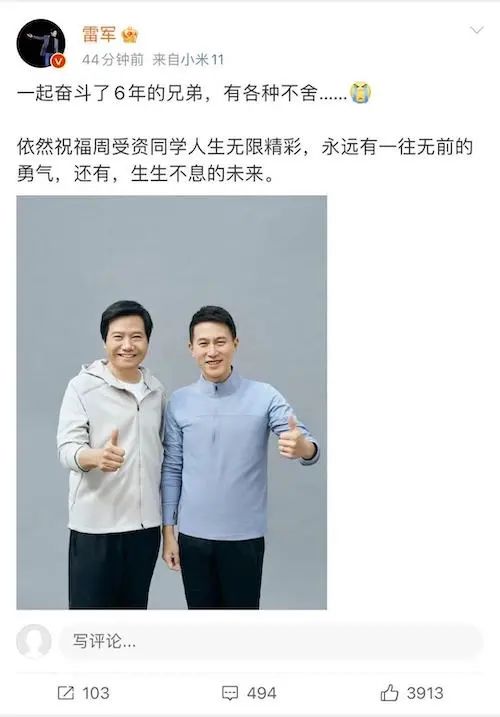 而在周受资宣布新动向后,小米董事长雷军也在微博表示,祝福周受资同学人生无限精彩,永远有一往无前的勇气,还有,生生不息的未来。