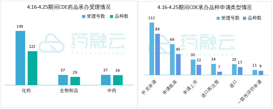 根据药融云中国药品审评数据,4月16号-4月25号期间共187个(按品种计,下同)药品获CDE承办,包括化药122个,生物制品29个,以及中药36个。