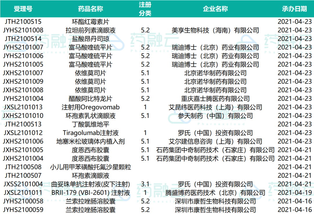 下表为2021.04.16-2021.04.25申请上市的药物情况。
