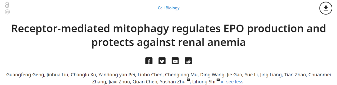 2021年5月4日,中国医学科学院血液病医院(中国医学科学院血液学研究所)石莉红课题组联合南开大学陈佺课题组、朱玉山课题组在eLife发表文章Receptor-mediated mitophagy regulates EPO production and protects against renal anemia,发现线粒体自噬参与调控EPO产生,并提出了以线粒体自噬为靶向的潜在治疗肾性贫血新思路【2】。