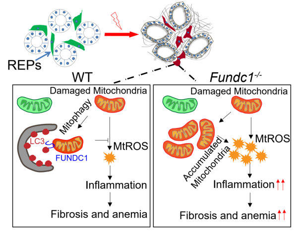 利用Fundc1-/-小鼠,发现在生理条件下FUNDC1介导的线粒体自噬并不参与红细胞成熟过程中线粒体清除。但意外发现其参与药物诱导急性溶血性贫血的发生,表现为Fundc1的缺失导致了EPO生成减少,贫血加剧,小鼠的生存率降低;而EPO补给则显著改善了其贫血的表型。分子机制分析发现,FUNDC1缺陷导致了损伤线粒体清楚障碍与累积,进而引起了细胞内ROS水平上升与炎症信号激活,REP细胞转换为成纤维细胞从而丧失了EPO分泌能力。同时研究也证明了FUNDC1介导的线粒体自噬能够保护不同压力应激模型(单侧输尿管梗阻 (UUO)模型和肾性贫血模型)中EPO生成。该研究显示线粒体质量控制是肾性贫血中EPO生成的关键调控环节,提出靶向线粒体自噬潜在治疗新策略。