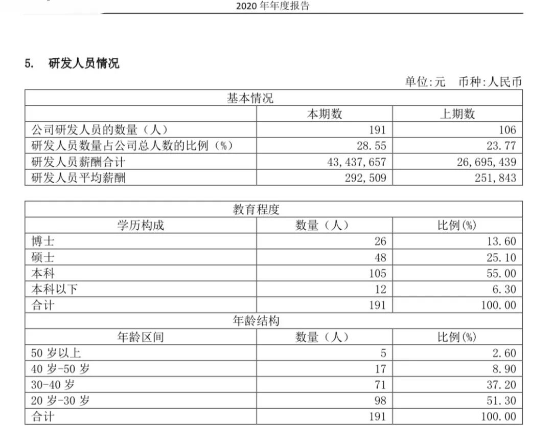 (2)2020年研发人员数量相对2019年大幅增加33%。2020年20家公司合计5366人,2019年4025人。