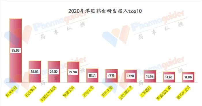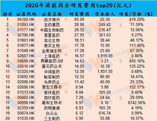 研发一直制药企业永恒的话题,研发费用投入的多少一定程度上决定着新药的产出。目前在香港上市的医疗健康领域的相关公司有170多家,其中制药企业有80多家。A股医疗健康领域有350多家公司,其中制药药企有250家左右。港股上市药企占比三分之一左右,不可忽视。尤其是2018年港交所新规后(新规是指香港联交所于2018年4月份修订主板上市规则,新增第18A章《生物科技公司》,允许未有收入、未有利润的生物科技公司提交上市申请),吸引了不少创新药企赴港上市,港交所的国际化程度也相对较高。目前港股上市药企年报基本披露完毕,我们及时总结了top20研发投入和营收情况。