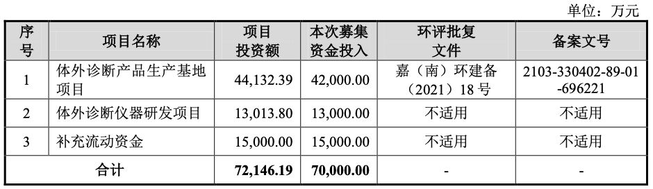 招股书显示,凯实生物本次上市募集资金将用于体外诊断产品生产基地项目(全称为年产3000套体外诊断医疗仪器及30亿件医用耗材CDMO研发中心、仪器和耗材生产基地项目),体外诊断仪器研发项目和补充流动资金。