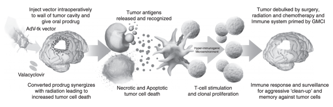 通过瘤内注射给药,腺病毒作为1个载体转运该激酶基因进入肿瘤细胞,患者口服抗疱疹药valacyclovir,胸苷激酶将小分子前药valacyclovir(FDA批准的抗疱疹药物)转化为有毒的核苷酸类似物,抑制DNA复制和修复,导致细胞凋亡,释放抗原,并上调促炎因子,肿瘤内的免疫抑制微环境由“冷”变“热”。