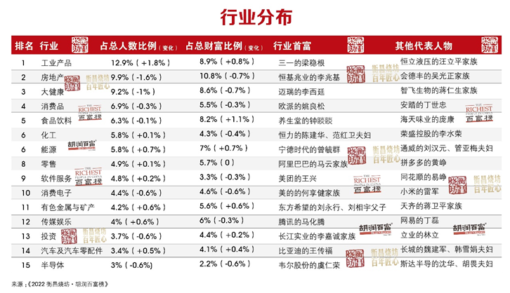 从行业板块来看,记者注意到,工业产品、房地产、大健康、消费品和食品饮料是上榜企业家的前五大财富来源。400多位企业家在过去一年中财富获得了增长,主要来自工业产品、食品饮料和能源这几个传统行业,相比之下,下降较多的是房地产和生物医药行业。