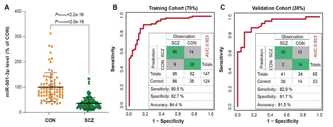 图2. miR-501-3p在精神分裂症外周血中显著下调及其预测精神分裂症的ROC曲线