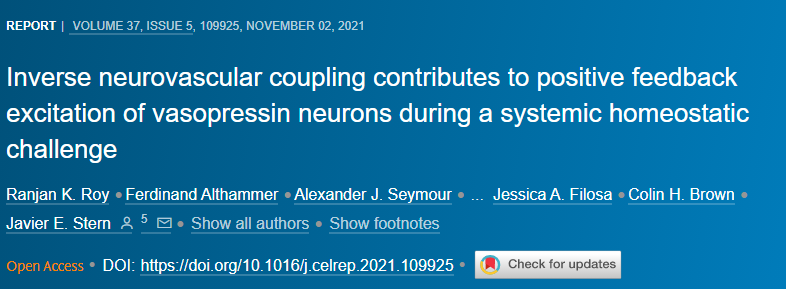 11 月 2 日,相关论文以《在系统性稳态挑战期间,反向神经血管耦合有助于加压素神经元的正反馈激发》(Inverse neurovascular coupling contributes to positive feedback excitation of vasopressin neurons during a systemic homeostatic challenge)为题发表在 Cell Reports 上。