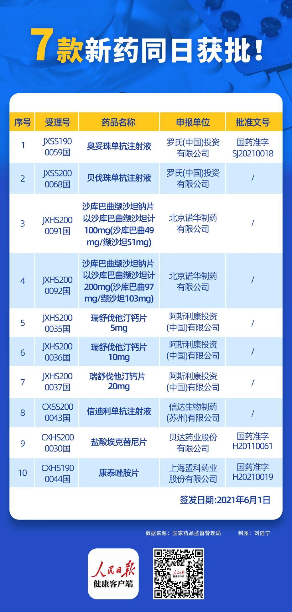 据国家药品监督管理局(NMPA)官网,健康时报记者不完全统计发现,从5月7日至6月6日,有超十款新药在国内获批上市或新增新适应症。其中有7款同日获批。包括新一代抗CD20单抗、PD-1抑制剂、EGFR-TKI等,涵盖滤泡性淋巴瘤、原发性高血压、非小细胞肺癌、肝细胞癌等多种适应症。