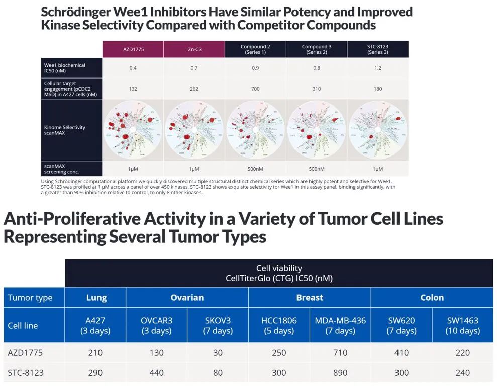 Schrödinger开发的Wee1抑制剂仍然采用AZD1775作为对标,在选择性上有所进步,但临床前数据似乎并没有太多优越性。不过,在动物模型中,STC-8123在停止给药后仍能表现持久的强大抑制功效。