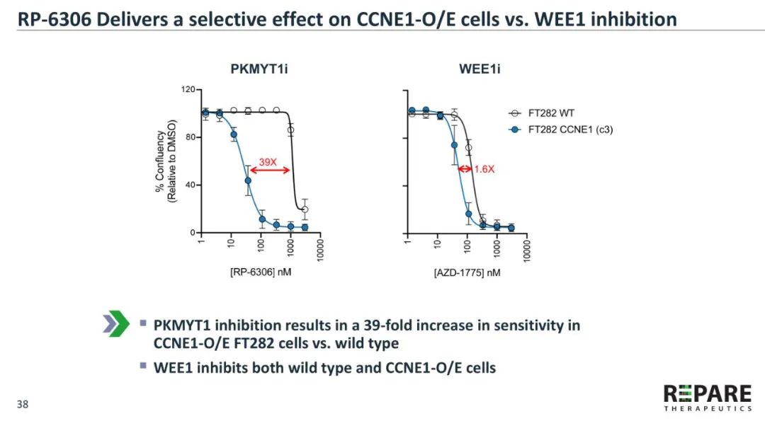 PKMYT1激酶又名MYT1,是WEE家族激酶成员,在细胞周期转换期间抑制CDK1磷酸化,对肿瘤细胞增殖、迁移和异种移植肿瘤形成具有重要影响。RP-6306是目前唯一进入临床的PKMYT1抑制剂,对CCNE1扩增、FBXW7缺失或其他特异性突变具有合成致死性。早期数据显示,相对于Wee1抑制剂AZD1775,RP-6306在CCNE1-O/E细胞中具有更好的选择性。