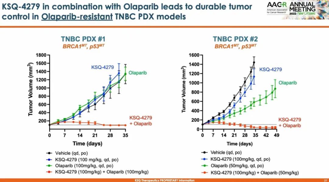 单药或联合奥拉帕利都能够在多个肿瘤模型中显示强大的肿瘤抑制,特别是在奥拉帕利的抗性三阴乳腺癌模型中,也是显现了巨大的治疗潜力。