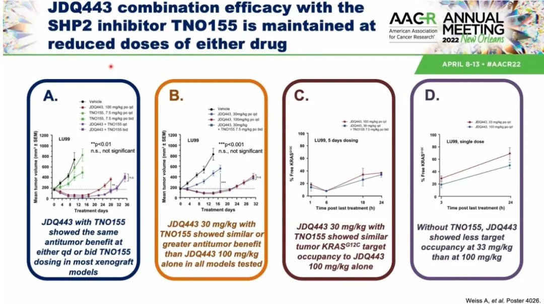 诺华的JDQ443在体外模型中与SHP2抑制剂TNO155联合应用时,给药方式并没有太多影响(QD/BID),但具备了降低给药剂量的潜力。当JDQ443低剂量联合TNO155时,与JDQ443高剂量显示相似的抗肿瘤功效,而低剂量时并没有显示优势的靶标占据,进一步增加了KRAS和SHP2的联用证据。