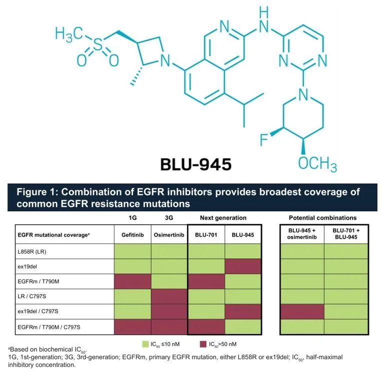BLU-945目前分子结构也已经公布,在AACR上公布的临床动态显示,BLU-945将要和奥希替尼开展联合给药,两家公司也已经签订临床合作协议。