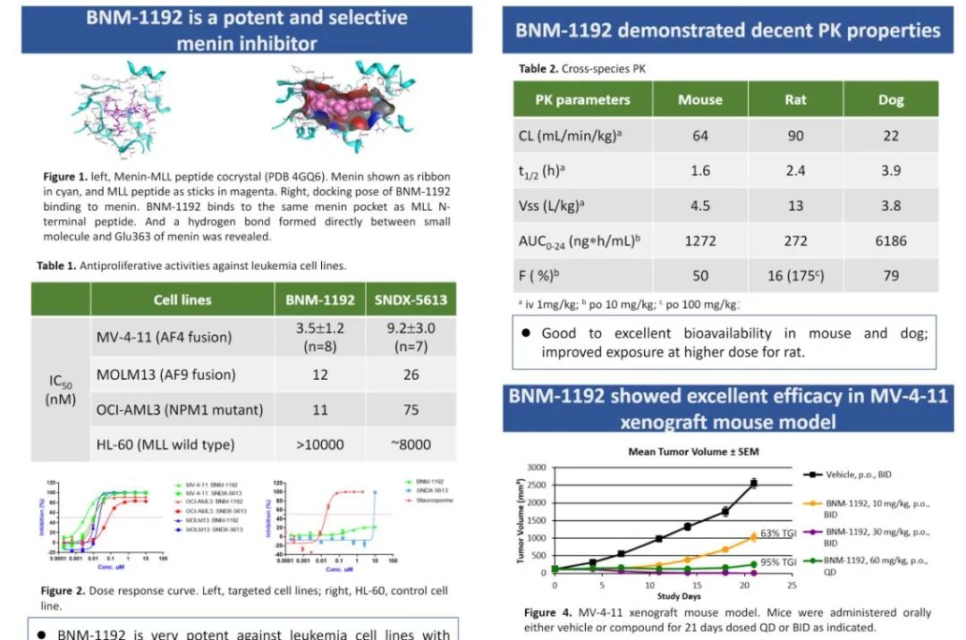 Menin 是一种参与转录调控、影响细胞周期控制、细胞凋亡和 DNA 损伤修复的蛋白质,在多种癌症的致癌信号传导中起直接作用。Menin也是魔方筛选的新机会靶点,在本届AACR会议上,BMF-219也带来了两项研究报告。