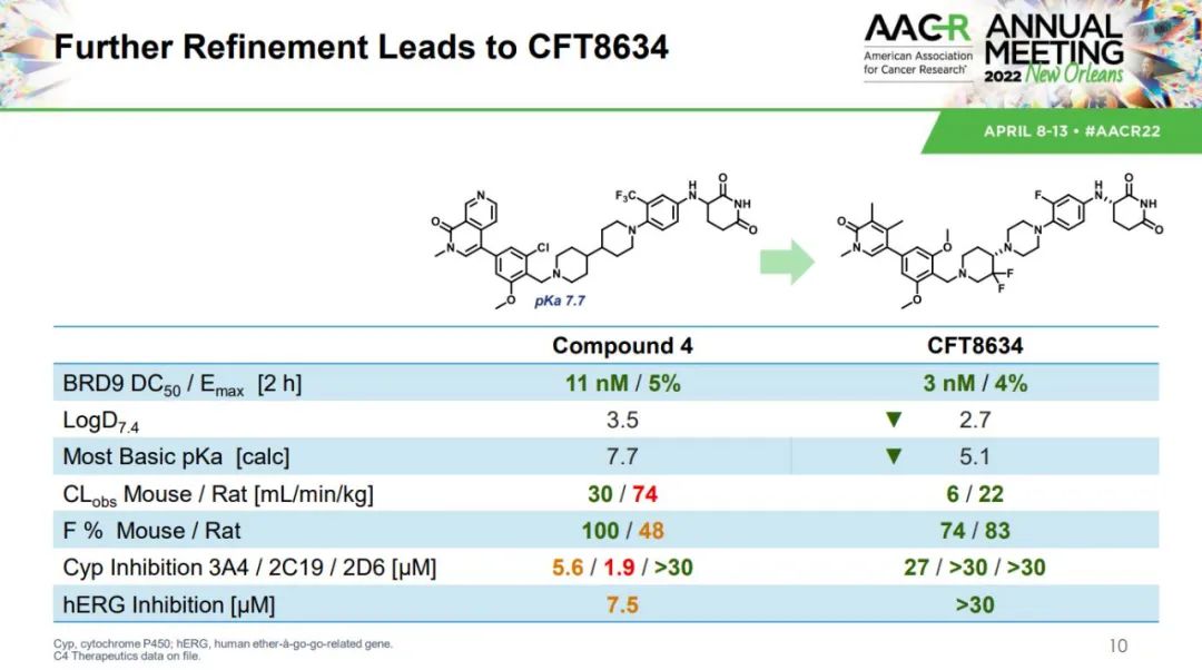 不过,对于业界而言,C4 公司公布了多个产品的分子骨架或研究数据,无疑能够帮助我们更加清晰的认识降解剂开发。除CFT7455之外,CFT8634是C4公司开发的一款BRD9 PROTAC候选药物,也是魔方筛选的新机会之一;CFT1946则是一款靶向突变BRAF的PROTAC分子,拟用于治疗BRAF驱动的肿瘤。