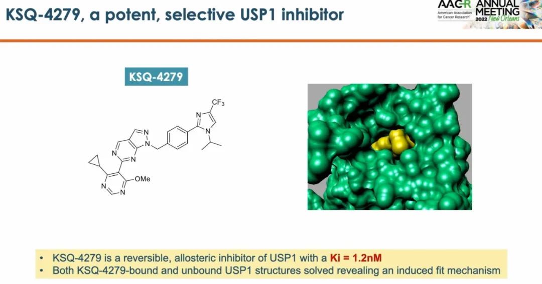 KSQ-4279同样是目前唯一进入临床开发的高效选择性的 USP1 抑制剂。KSQ-4279 在细胞中导致USP1单泛素化底物的积累,并抑制具有 BRCA 突变或其他 HRD 改变的癌细胞系的增殖。并且,KSQ-4279 与 PARP 抑制剂联合作用的研究揭示了细胞系中协同作用的明确证据。