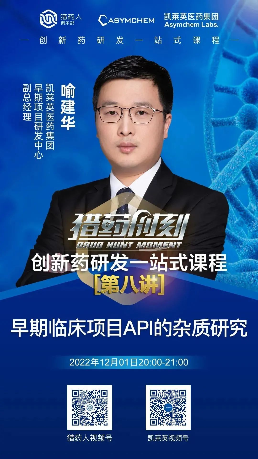 作为《创新药研发一站式课程》第八讲,猎药时刻栏目特邀凯莱英医药集团早期项目研发中心副总经理喻建华博士于12月1日晚20:00带来《早期临床项目API的杂质研究》课程。