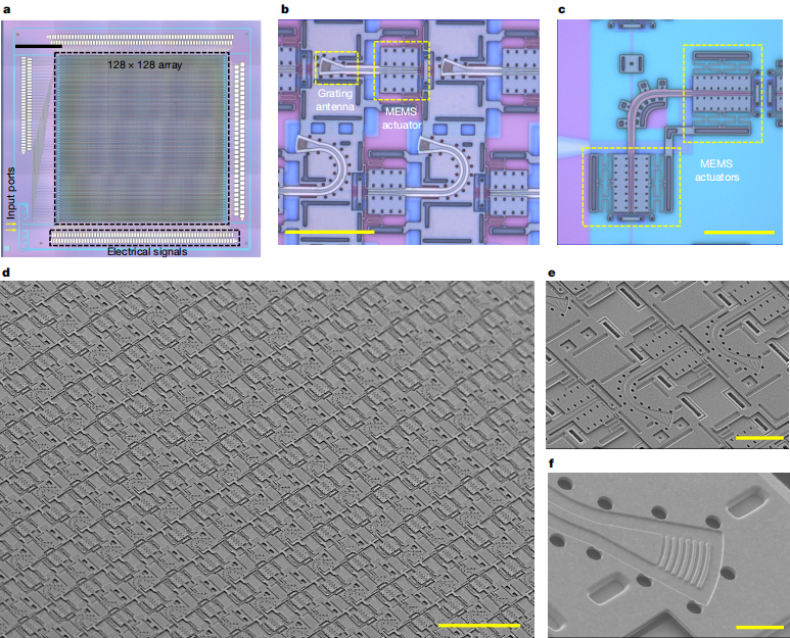 自 2018 年,该团队经过四年的不懈努力,研制了这个 16384 像素的调频连续波(FMCW,Frequency-Modulated Continuous Wave)成像激光雷达,单片集成了 128×128 个硅光子 MEMS 焦平面开关和光栅天线(实验中引线键合并测试了其中一个 128×96 子阵列)。