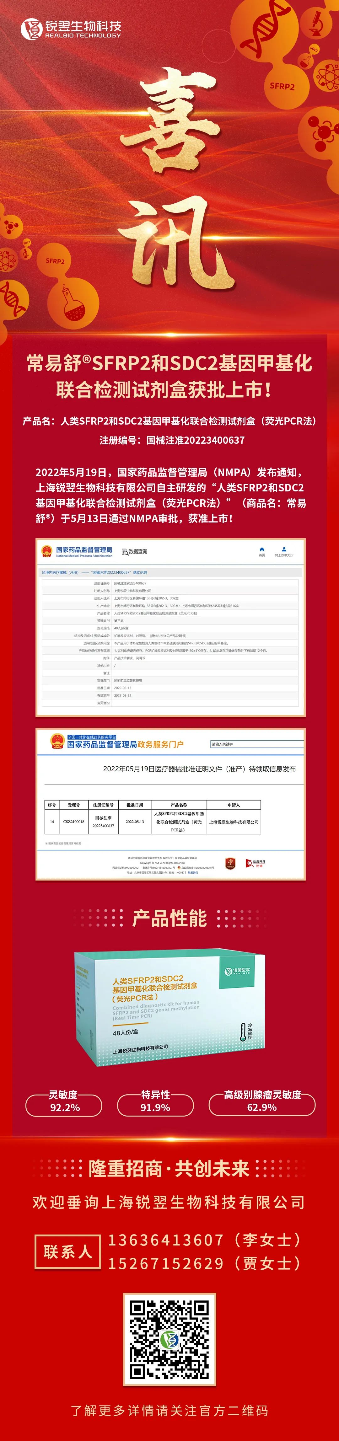 锐翌生物常易舒®SFRP2和SDC2基因甲基化联合检测试剂盒通过NMPA审批,获准上市!