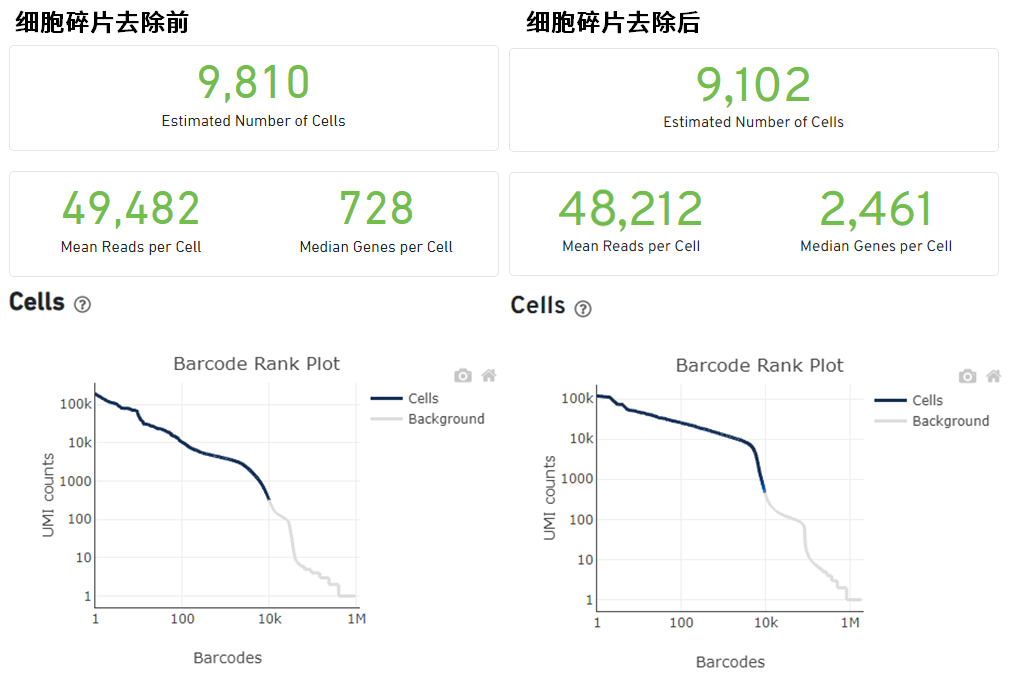 图24 利用细胞碎片去除试剂盒处理单细胞悬液前后样本测序数据结果