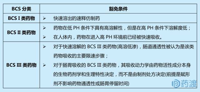 生物药剂学分类系统(BCS)是一种药物开发工具。对同时具备BCS I类(高溶高渗)和快速溶出的速释仿制药,申请人可提请生物等效性豁免。BCS II类(低溶高渗)和BCS III类(高溶低渗)同样可以申请生物等效性豁免。